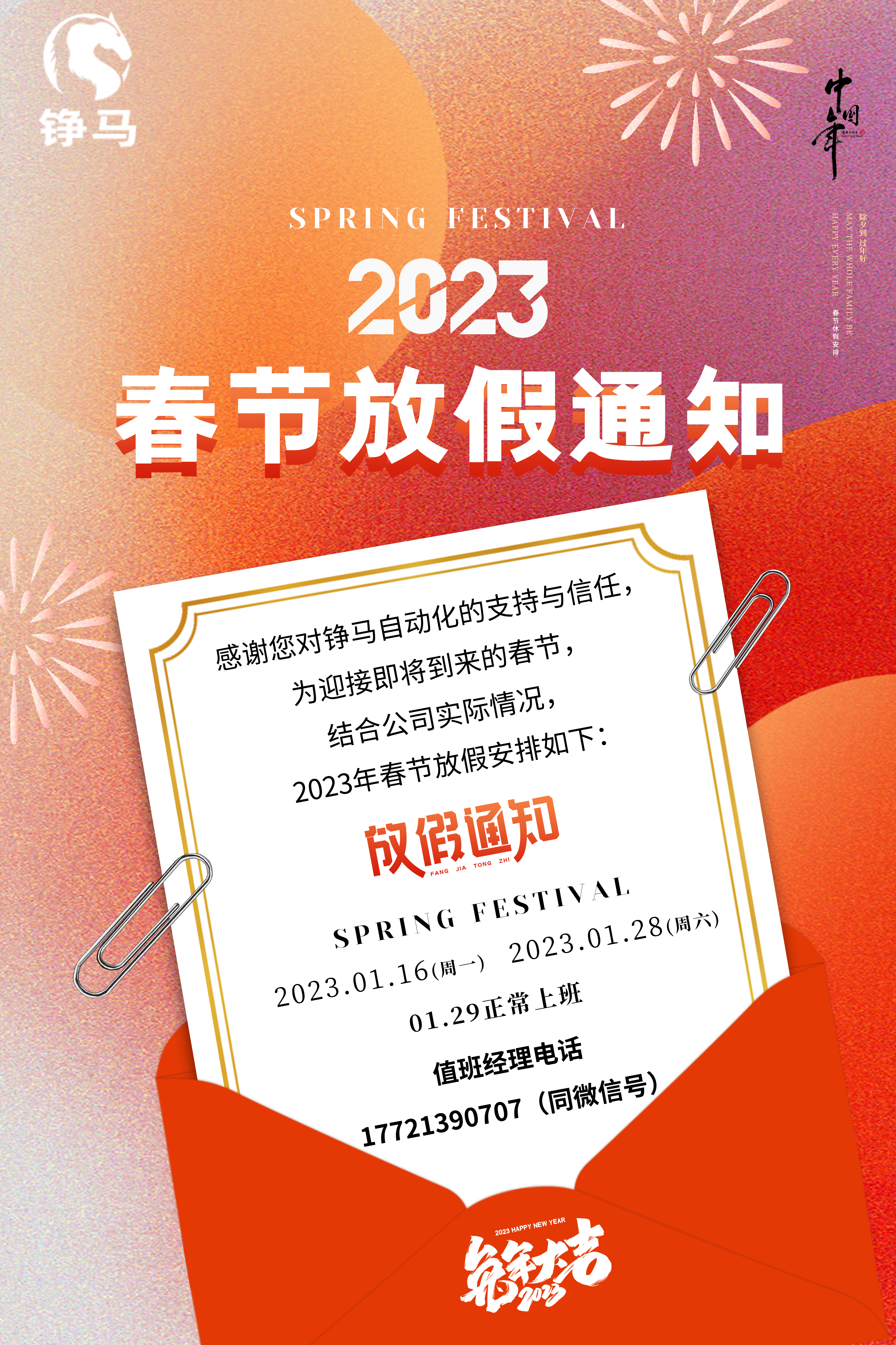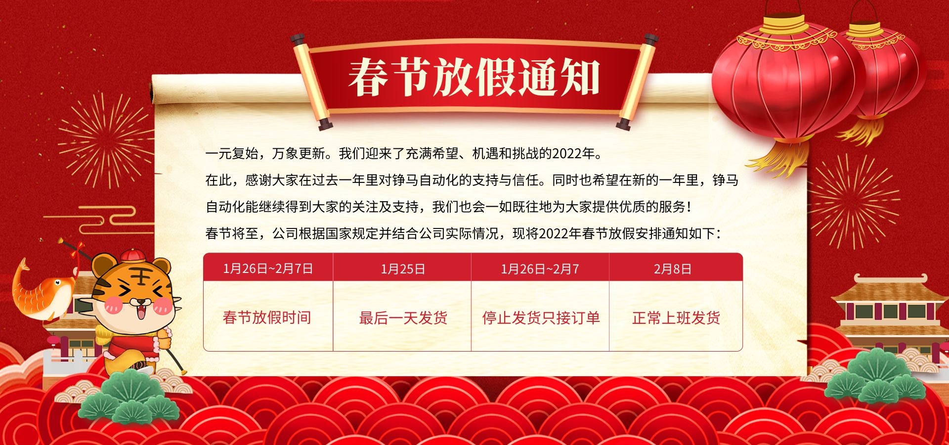 感謝您在過去的一年里對我們的關注、信任與支持。飲水思源,在新的一年,錚馬自動化將秉持初心,繼續以優質高效的服務為您提供更加全面的服務!值此新春佳節,錚馬自動化在此瑾向各位致以誠摯的祝福和問候:愿所念之人,平安喜樂;愿所想之事,順心如意!根…